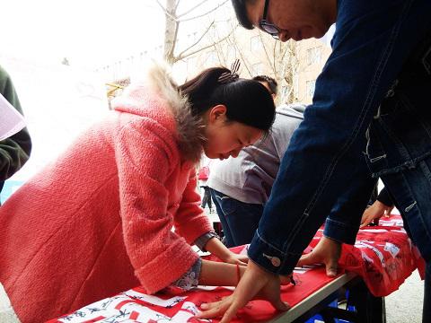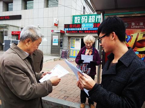 为了保证活动能够顺利进行,组长邹艳慧给小组成员提前详细分配了任务。活动过程中,小组成员分两批有序地展开工作。一组由班长带领前往校外发放宣传单,并对群众提出的问题进行解答,另一组则由组长带领在西山一条街进行宣传,号召行人在宣传条幅上签名并填写调查问卷,并赠送小礼品。参与签名活动的人涉及广泛,有本科生、研究生、在职教师、已退休教授等,还有吉林大学同学前来助阵。活动同时还随机采访了路人,征集了一些有关民生问题的意见及建议。为扩大活动范围,小组更是将宣传工作推广到学生宿舍,在级队宣传板上张贴了活动海报、活动宣传单,并走寝宣传填写调查问卷。