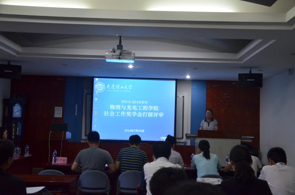 为奖励在学生社会工作及学生活动中有突出组织表现的学生干部同学,7月20日下午,2015-2016学年物理与光电工程学院社会工作奖学金打擂评审大会在物理系楼322顺利召开。大珩1501班班主任、等离子方向教授王正汹老师,学院副书记兼副院长杨木老师,1502班班主任、光学方向教师王乔老师,1503班班主任、微电子方向教师张炳烨老师以及2014级辅导员梁勇老师担任评审。会议由物理2015级辅导员纪丹红老师主持。
